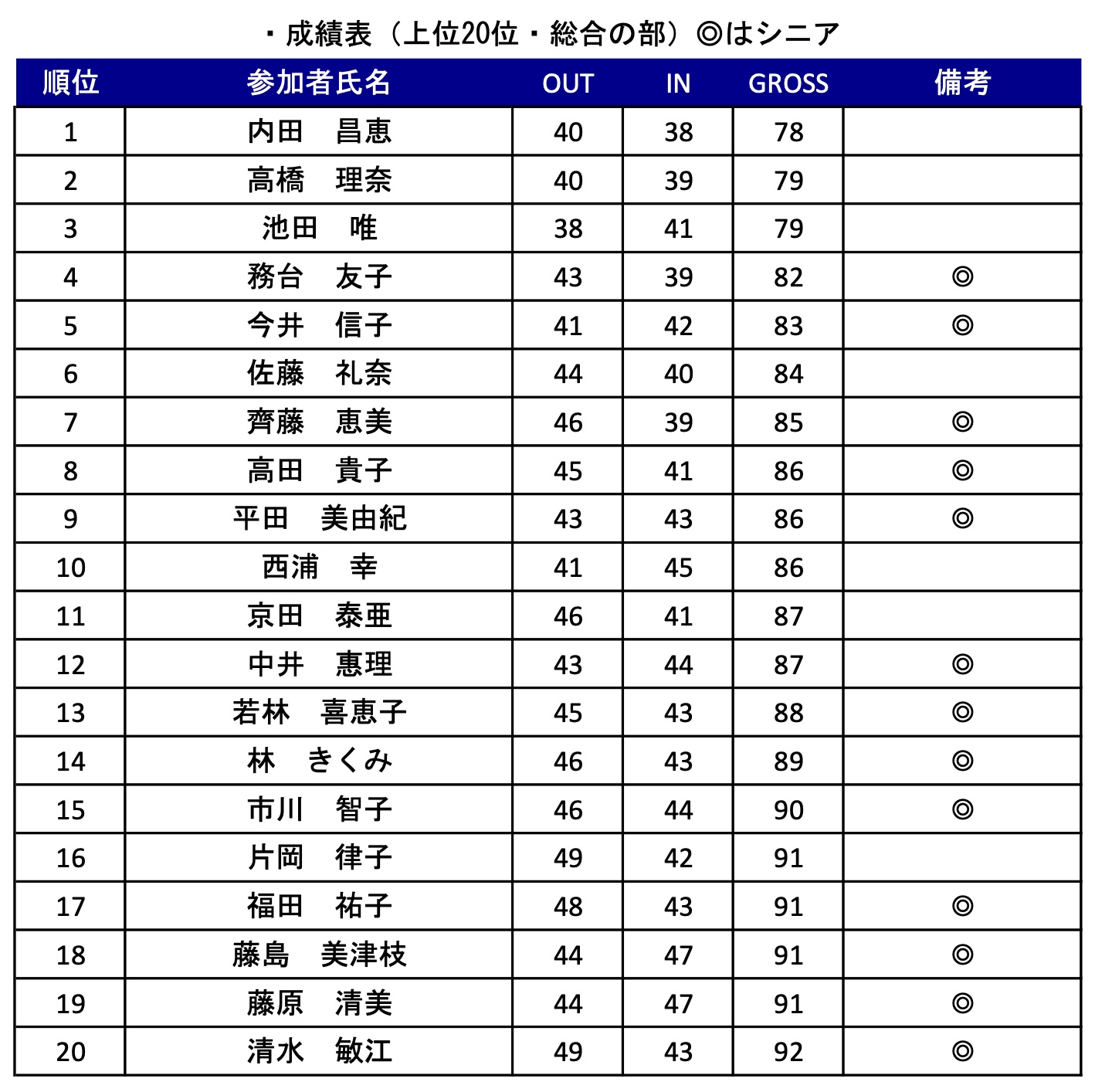 厚生労働大臣杯 厚生労働大臣杯第9回全日本社会人女子ゴルフ選手権競技会 決勝大会 第9回全日本社会人女子ゴルフ選手権競技会は2024年10月22日(火) 千葉県成田市の成田ゴルフ倶楽部(18ホール・ストロークプレー)で行われ、 内田昌恵選手が優勝、シニアの部の優勝は務台友子選手が優勝されました。 出場選手:37名(一般14名、シニア23名) 天候 晴れ、 ティーオフ 8:00より 総合部門 優勝 内田昌恵選手 シニアの部 優勝 務台友子選手 ハンディキャップ部門 優勝 西村 幸選手 総合部門入賞者 シニア部門入賞者 ハンディキャップ部門入賞者 主催:NPO法人日本ゴルフ大学校、NPO法人日本ゴルフ指導者協会 後援:厚生労働省、一般財団法人職業技能振興会(FOS)、株式会社ゴルフタイムス社 協力団体:成田ゴルフ倶楽部、木更津ゴルフクラブ、天野山カントリークラブ、泉パークタウンゴルフ倶楽部、富士平原ゴルフクラブ、志摩シーサイドカンツリークラブ 野見山知子大会運営本部長挨拶 株式会社ゴルフタイムス社代表取締役 古賀剛大様挨拶 田中幸仁JGIS西日本支部長 挨拶 乾杯の挨拶 第8回大会シニアの部優勝 務台友子選手 【総合部門】 総合部門 準優勝 高橋 理奈選手 総合部門 第3位 池田 唯選手 【シニア部門】 シニア部門 準優勝 今井 信子選手 シニア部門 第3位 齊藤 恵美選手 【ハンディキャップ部門】 ハンディキャップ部門 準優勝 佐藤 礼奈選手 ハンディキャップ部門 第3位 若林 喜恵子選手 厚生労働大臣杯第6回全日本社会人女子ゴルフ選手権競技... 厚生労働大臣杯第10回全日本社会人女子ゴルフ選手権競...